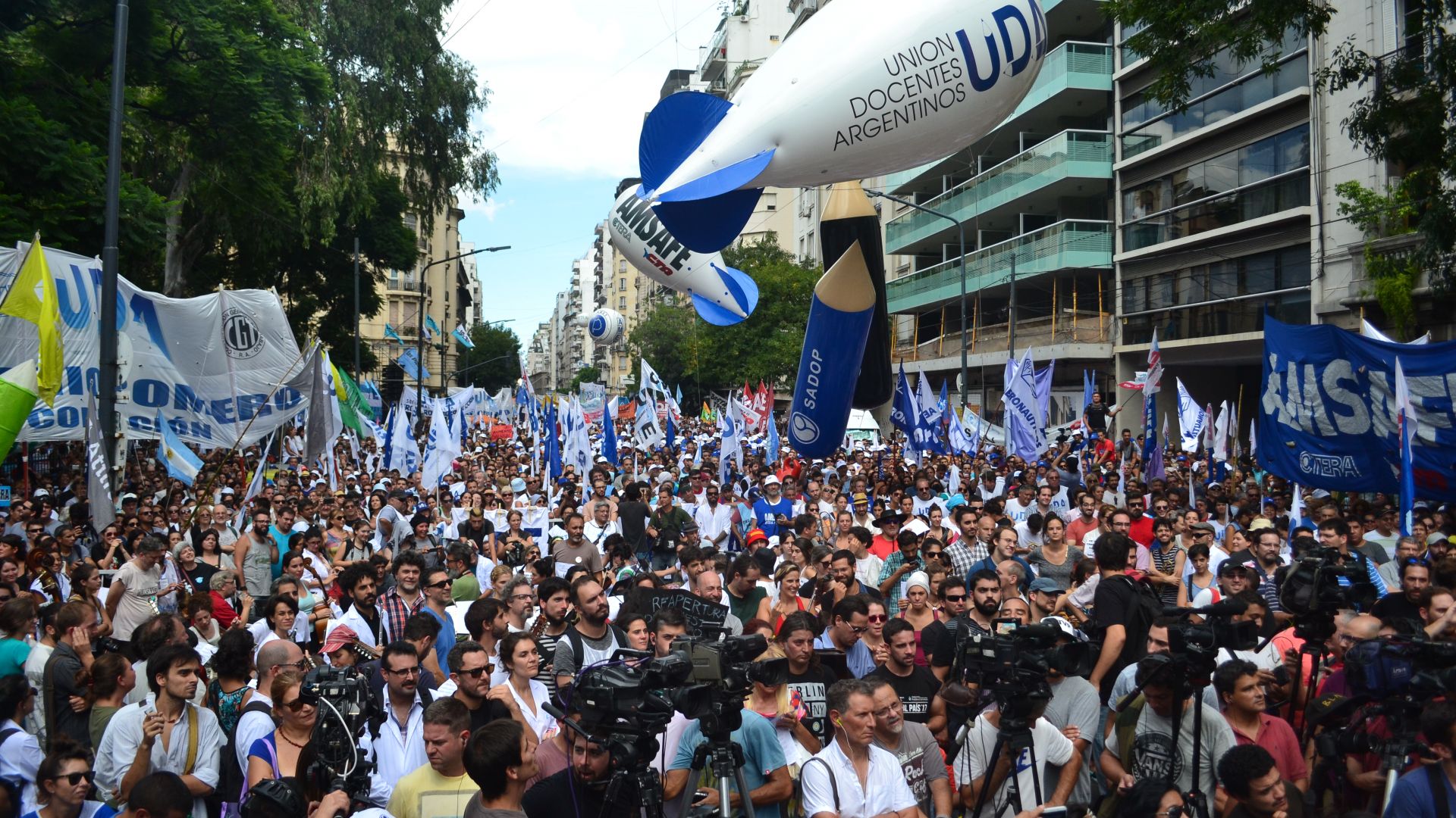 La marcha fue convocada por el Frente Nacional Docente -conformado por los 5 gremios nacionales: CTERA, UDA, SADOP, CEA y AMET- en el marco de un paro nacional del sector que se extenderá por 48 horas. Significó el inicio de una semana de lucha para el movimiento obrero y una demostración de que los docentes están de pie, a pesar de los aprietes y las amenazas del macrismo, que pretende imponer un techo de 18% a nivel nacional.
