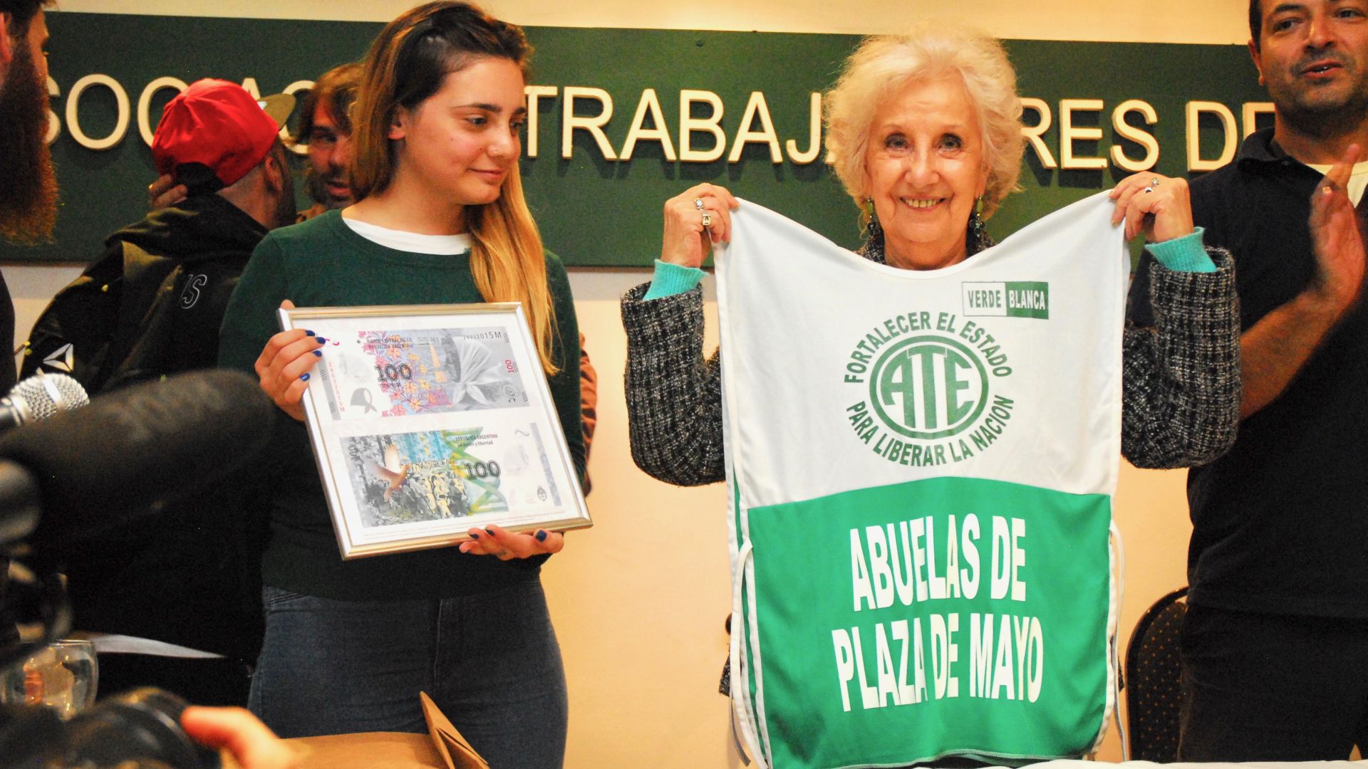Durante el emotivo e histórico encuentro, Carlotto participó de la inauguración del SUM de ATE Capital "Abuelas de Plaza de Mayo" y acordó junto a Daniel Catalano la firma de un convenio entre el sindicato y Abuelas. Además, se le hizo entrega de una carta de puño y letra de Milagro Sala y recibió, entre otros regalos, un cuadro con el billete de cien pesos y la imagen del pañuelo blanco.